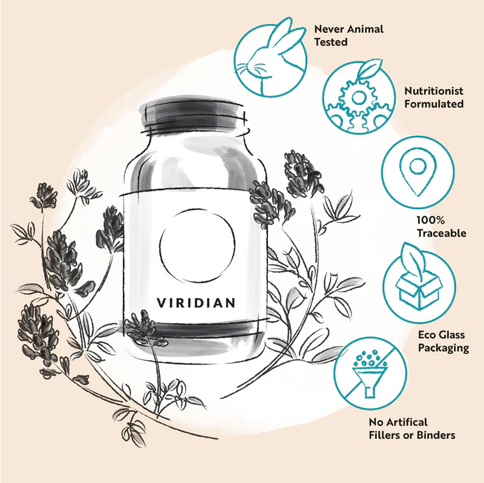 Viridian supplement bottle with brand logo and certification icons on a beige background